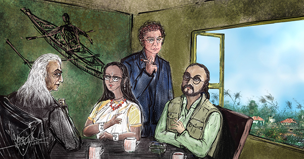 জানালা দিয়ে বাইরের দৃশ্যের দিকে ভুরু কুঁচকে তাকিয়ে আছেন ব্রহ্ম ঠাকুর। এরিক দত্ত বসে আছেন টেবিলটার অন্যধারে। বেশ মোটা একটা কাগজের ফাইল হাতে করে লতিকা যোগ দিয়েছেন আলোচনায়। সামনের টেবিলে জায়গা কম, তাই ফাইলটা আপাতত তিনি পাশের একটা ফাঁকা চেয়ারের উপর রেখেছেন। ফাইলের মধ্যে কিছু ছবি আছে, আছে কিছু প্রিন্টআউট। বোঝাই যাচ্ছে, সঠিক সময়ে সেগুলো সবার সামনে তুলে ধরা হবে।
