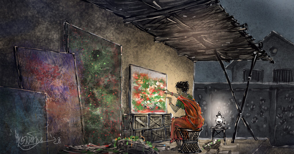 মিয়াঁ আর আপত্তি করল না। গোয়ালের অন্য দিকটা পরিষ্কার করে নিতেই, পুরনো একটা ত্রিপল কিনে এনে টাঙিয়েও দিল মিয়াঁ। চোরের মতো রাত জেগে-জেগে আঁকা সেই ছবিগুলো সাজানোও হল গ্যালারির দেওয়ালে। আমাকেও সেখানে যেতে হবে শুনে, বাবার কাছে গিয়ে বললাম, লেখাপড়া জানি না, কথা বলতে গেলেই দেহ যেন পাথর হয়ে যায়—আমি গিয়ে কী করব!