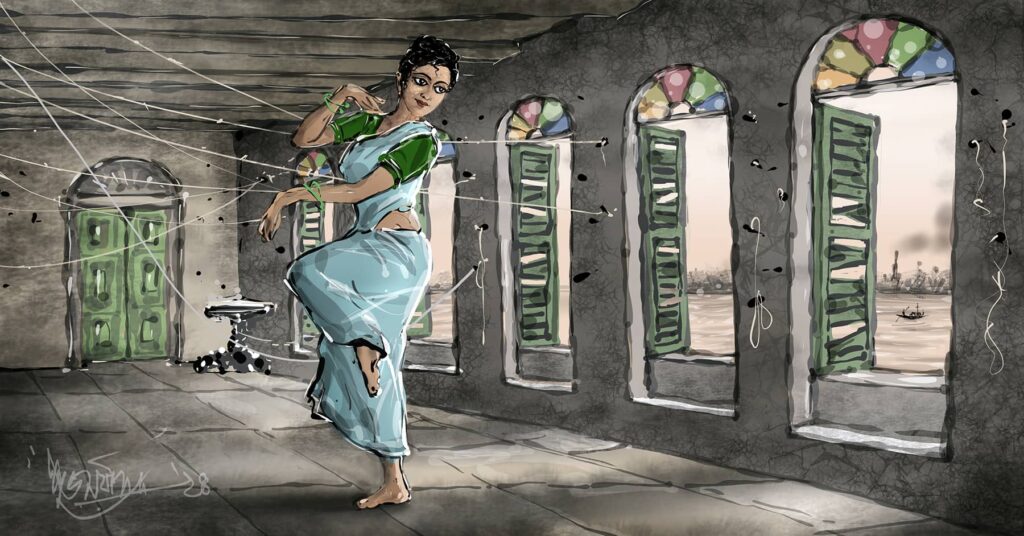 মেসবাড়ির কন্ট্রাক্টটা আর রিনিউ না করে, জ্যাঠাইমা শেষে বিক্রিই করে দিলেন বাড়িটা। বাড়িটা বিক্রি হয়ে যাওয়ার আগে, ঝিনি অবশ্য একবার এসেছিল; এবং আগে থাকতে আমাকে খবর দেওয়ায়, আমিও দেখা করেছিলাম তাদের ওই বাড়িতে গিয়ে। ওই ঘরে ঢুকতেই দেখেছিলাম যে, সার-সার জানলার সব ক’টা পাল্লা খুলে দিয়ে, গঙ্গার দিকে তাকিয়ে আছে ঝিনি; স্টুডিয়োঘরের জানলার কাঁথে চুপ করে বসেছিল সে। কী যে সুন্দর দেখাচ্ছিল তাকে! আমাকে দেখেই বসতে বলল। এরপর নিজে উঠে দাঁড়িয়ে, ঘরের মাঝখানে এসে নাচতে শুরু করল। নিজেই কবিতা বলছে, আর নেচে যাচ্ছে। এদিন সে পরেছিল নীল তাঁতের শাড়ির সঙ্গে ঘন সবুজ রঙের একটা ব্লাউজ; উঁচু করে বাঁধা খোঁপাতে লাগানো ফুলটা একটু নেতিয়ে গেছে; আঁচলটা কোমরে জড়ানো; তার দু’পায়ের গোছায় পরাছিল আঁজি-আঁজি সুতোর মতো পেতলের নূপুর। কী জানি কোথা থেকে যে এমন সুন্দর করে সাজতে শিখেছে ঝিনি! এমন নাচই বা কবে শিখল সে! পেরেকের গর্তে ভরে থাকা দড়ির টানা দেওয়া দেওয়ালগুলো একটু-একটু করে যেন চাপা পড়ে যেতে লাগল, তন্ময় হয়ে ঝিনির বলা সেই কবিতা আর নাচে।