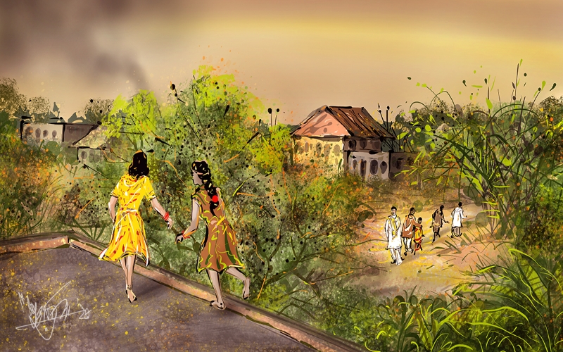 তরুর বাবার মুখের দিকে ফ্যালফ্যাল করে কিছুক্ষণ তাকিয়েই, মুখে আঁচল চাপা দিয়ে কাঁদতে লাগলেন তরুর মা। কিছুতেই ভেবে পেলেন না যে, পাড়াপড়শি, আত্মীয়স্বজন সকলকে আড়াল করে, এই বিভুঁইয়ে এসে তরুর বিয়ে হচ্ছে কেন! ভেবে পেলেন না যে, তার স্বামীও কেন তাঁকে কিছুই জানালেন না! খুব মন খারাপ হয়ে গেল এ কথা ভেবেও যে, তাঁর এবং তাঁর দুই জায়ের বাপের বাড়ির কেউই বিয়েতে উপস্থিত থাকতে পারবে না ভেবেও। ঠিক কোন দিক থেকে হাল ধরতে হবে আন্দাজ করতেই যেন, চোখের জল মুছে নিজেকে সামলে নিলেন তরুর মা। ভাবলেশহীন মুখে তরুর বাবা আর জ্যাঠামশাই দুজনেই, হাতল দেওয়া দুটি ইজিচেয়ারে স্থাণুবৎ বসে রইলেন। সেই ম্যানেজার মতো লোকটার সঙ্গে হাত লাগিয়ে যাবতীয় যা ব্যবস্থা, সে সবই করতে লাগলেন তরুর ছোটকাকা। তাঁদের জিনিসপত্র সমেত একটা ঘরে গিয়ে মা-কাকিমা আর জেঠিমা তো দোর দিলেন। জ্যাঠামশাইয়ের নির্দেশ মতো তরু, ঊষা এবং তরুর তিন বোন লটরপটর করতে করতে অন্য একটা ঘরে গিয়ে কী যে করবে ভেবেই পেল না। তরুর ছোটভাই এই সুযোগে একা একাই খেলে বেড়াতে লাগল, উঠোন লাগোয়া বাড়ির বাগানে। পাঁচিল এবং গাছে গাছে বুড়ো-বাচ্ছা এবং ধাড়ি হনুমানদের লাফালাফি দেখে তরুর বাবা তাকে কাছে ডেকে কোলে নিয়ে বসে রইলেন। তরু আর ঊষা একে অপরের মুখের দিকে না তাকিয়ে, রাস্তার দিকে মুখ করে ঠায় দাঁড়িয়ে রইল পেল্লায় দুটো জানলার শিক ধরে।