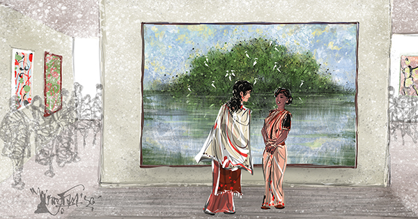 শাফিকার আঁকা লতাপাতা ছাওয়া, এই জলাজমি বা ডোবাটার কেমন যেন একটা টান আছে। কোনও গাছেই বুনোফুল ধরায়নি সে। নিশ্চিন্তে ডানা মুড়ে বসে থাকা বকগুলোই যেন ফুলের থেকেও সুন্দর। আকাশি নীল আর সাদার মধ্যে জেগে আছে ঘন সবুজের মরকত-বাহার। বার বার তাই মনে হচ্ছে, জীবনানন্দের কবিতায় প্রকৃতি যেমন এক অনাস্বাদিত রহস্য জাগায়, শাফিকার এই আঁকাও যেন তাই; রহস্যময়। তার নিজস্ব চরাচরের একফালি গহন যেন বড় নিবিড় হয়ে ধরা দিয়েছে এই আয়ত ফ্রেমে।