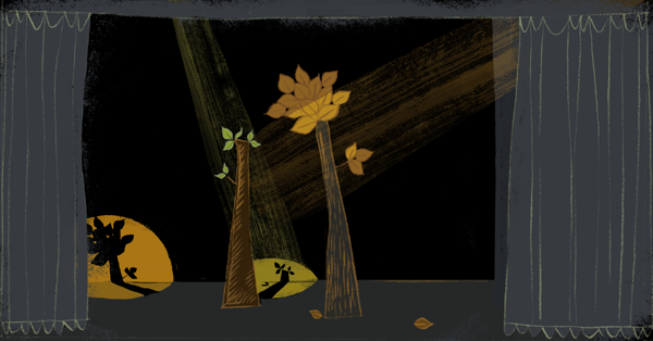 চারিদিকে ধ্বংসস্তূপ, ছাই-ধোঁয়া, নোংরা-আবর্জনা, স্টেজের মাঝ বরাবর দুটি গাছ— একটি সম্পূর্ণ ন্যাড়া, রুক্ষ, একটিও পাতা নেই; অপরটিতে সামান্য ক’টি পাতা আছে, যদিও বেশিরভাগই হলুদ। একজন পথিক, পরনে দামি স্যুট, বুট জুতো, চুল এলোমেলো, গালে বড়-বড় দাড়ি, সারা শরীরে ধুলোর ছাপ স্পষ্ট, রুক্ষ ন্যাড়া গাছটার নীচে হাঁটুতে মুখ গুঁজে সোজা দর্শকদের দিকে নিষ্পলক দৃষ্টিতে তাকিয়ে। আরেকজন মানুষ খালি গা, একটা ময়লা গামছা গলায় রাখা, একটা বারমুডা পরা— এরও সারা শরীরে ধুলো, চুল উসকোখুসকো, মুখভর্তি দাড়ি, দাঁত নোংরা, কাঁপতে-কাঁপতে অপর গাছটির তলায় বসল। স্টেজে সাদাটে আলো। মাঝে মাঝে কাঁপছে। দুজনের একজনও একে অপরকে দেখেনি। একই ভাবে দর্শকদের দিকে তাকিয়ে বসে। একদম চুপচাপ চারিদিক। মিনিট দুই-তিন এভাবেই বসে থাকল দুজন। দ্বিতীয় ব্যক্তির হঠাৎ জোরে কাঁপুনির শব্দে প্রথম ব্যক্তি দ্বিতীয় ব্যক্তির দিকে তাকায়।