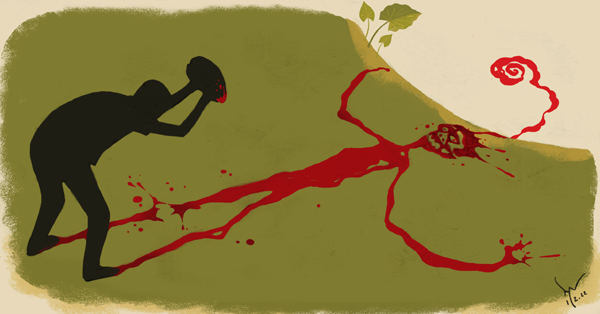 সে, ক্ষুরটা, সরাসরি নিজের পেটে ঢুকিয়ে দেয়। ধুপ করে শব্দ হয়। একটু গুঙিয়ে পেটার পড়ে যায়। আমি আবার সেই মিষ্টি সুরটা শুনতে পাই। খুব আস্তে, চরাচর জুড়ে বেজে উঠছে। কে বাজাচ্ছে, এখন, এই চায়ের কেবিনে? সবাই স্থির ও চুপ। সবাই মেঝেয় লুটিয়ে পড়ে থাকা পেটারকে দেখছে। আর আমি, কিছুতেই বুঝতে পারছি না, সুরটা কোথা থেকে আসছে।