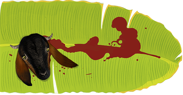 এ তল্লাটে সিঙ্গাপুরি কলা চাষের খুব জোর। বিঘের পর বিঘে কলার ক্ষেত। ট্রাক-বোঝাই কলা দূরদূরান্তে চালান যায়। কলা হল গিয়ে লক্ষ্মী। তাই কলাবাগানে আঁশ ঢোকানো বারণ। শীতকাল ফিসটির মরসুম। চারিদিকে তারস্বরে মাইক বাজছে। দলে দলে সব চলেছে হাঁড়ি-ডেকচি-মাংস-মশলা নিয়ে নদীর চরে বা বাবুদের বাগানে পিকনিক করতে। শুধু কলাবাগানে ওসব নিষেধ। স্থানীয় কলাচাষি সমিতি নোটিস দিয়ে রেখেছে, ‘কলাবাগান দেবত্বস্থান। এখানে ফিস্ট করা নিষেধ। অন্যথায় জরিমানা হইবে। অনুমত্যানুসারে।’ যাকে বলে বাঘের ঘরে ঘোগের বাসা। তিনকড়ি কলাবনে ঘাপটি মেরে ছিল অস্ত্রপাতি নিয়ে। সুবল আগে থেকে চাল-মশলা-হাঁড়ি-ডেকচি এনে রেখে গেছে। এখন তার ওপর দায়িত্ব পড়েছে অবতারকে ভুলিয়েভালিয়ে এখানে নিয়ে আসা। সে কাজে খুব একটা বেগ পেতে হয় না সুবলকে। অবতার ভয়টয় জানে না। পুরুষ্টু পাকা কলার লোভ দেখিয়ে তাকে কলাবনের গভীরে চপার হাতে অপেক্ষায় থাকা তিনকড়ির সামনে নিয়ে আসে সুবল। তিনকড়িকে দেখে আনন্দে শিং বাগিয়ে ঢুঁসোতে যায় অবতার, খেলা। ‘ওই দ্যাখো, ওই দ্যাখো’ বলে সেই ঢুঁয়ের ধাক্কা সামলাতে সামলাতে মুখ দিয়ে চুকচুক শব্দ করতে থাকে তিনকড়ি। আরামপ্রিয় পাঁঠা শান্ত হয়ে আদর খাবে ভাবে। অবতার ঘাড় বাড়িয়ে দেয়।