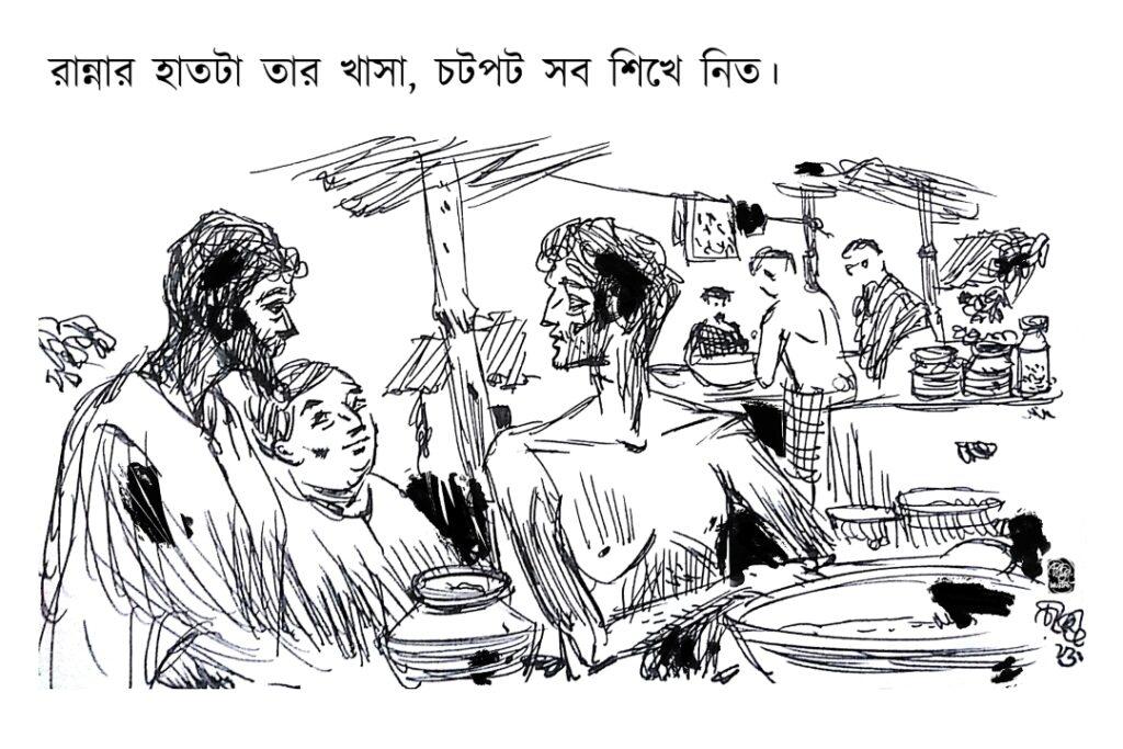 খানিকক্ষণ চুপ করে থাকল শিরোমণি, তৈমুরকে আর দুটো গরম লুচি দিতে ইশারা করল মা-মরা ভাগ্নে রতনমণিকে। তৈমুর লুচিতে থালার কিনারার তরকারির মশলা মুছে নিতে নিতে বলল, ‘দ্যাখনের দ্যুনা এ্যাখোন। তুমি তুমার রান্না দ্যাখামিন, হামি লগদে ভিড্যু ক্যরে ইউটিউবত তোমার রান্না ছ্যাড়ে দিমো। ট্যাকা আসা আরোম্বো ক্যল্লে আদ্দেক তোমার, বাকি আদ্দেক হামার।’