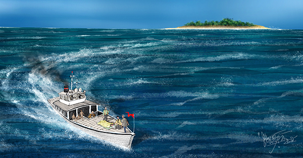 তিনজন বামন সাইজের জংলী মানুষ এসে প্রথমেই দুটো বিষতির টেনে তুলে ফেলেছে ব্রহ্মের পিঠ আর কাঁধ থেকে। তারপর ক্ষতস্থানে কী যেন ঘষে দিয়েছে জোরে ঠুসে। ব্রহ্মকে বহন করে সেন্টিনেলিজ়দের দ্বীপের অদূরে সমুদ্রে ভাসমান একটি ভেলাতে তুলল ওরা। ভেলাটিতে অপেক্ষা করছিল আরেকজন তাদেরই সমগোত্রীয়। এই ভেলাটি বাঁশের, বনজ লতা দিয়ে বাঁশগুলোকে টানটান করে বেঁধে এটা তৈরি হয়েছে। টানাহ্যাঁচড়ায় আরও অনেকটা খুলে যাওয়া চোখ বাঁধা কাপড়ের ফাঁক দিয়ে ভেলাটা দেখে ব্রহ্ম ঠাকুরের ভীষণ চেনা লাগল। এই ভেলাটা তিনি আগে কোথাও দেখেছেন…