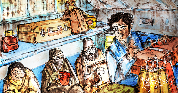 লাল দাড়ি আর ফেজ টুপিওয়ালা লোকটার সাথে একটা ছোট ব্যাগ— অনেকটা ইলেকট্রিক মিস্ত্রিদের হাতে যেরকম থাকে (ইলেকট্রিক মিস্ত্রিদের হাতে কি স্পেশাল ধরনের ব্যাগ থাকে? তাহলে আমার কেন ইলেকট্রিক মিস্ত্রির কথাই মনে হল?)। তিনি ব্যাগটাকে প্রায় জাপটে ধরে বসে আছেন। আর একদৃষ্টিতে আমার দিকে তাকিয়ে আছেন। আমার অস্বস্তি হতে লাগল। কিছুক্ষণ পাত্তা না দেবার ভান করে এদিক-ওদিক তাকালাম, ভাব করলাম যেন খুব জটিল কিছু নিয়ে ভাবছি। তারপর আড়চোখে চাইলাম। আশ্চর্য! লোকটা এখনও আমার দিকে তাকিয়ে আছেন! এতক্ষণে এক সেকেন্ডের জন্যও চোখ সরাননি! অদ্ভুত তো! অস্বস্তিটা আরও বাড়ল। এ আবার কী! এটা তো ভয়ানক অসভ্যতা হচ্ছে, আমি তাঁর ছেলেকে জায়গা ছেড়ে দিলাম আর তিনি… লোকটা কি মুখের ভাষা বুঝতে পারে না কি! আমি যে জানলা ছেড়ে দেওয়ায় বিরক্ত ও অসন্তুষ্ট হয়েছি তা কি তিনি ধরে ফেলেছেন?