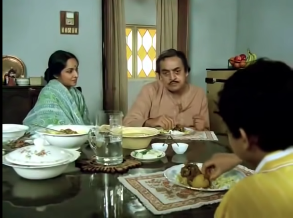 আবার ‘‌শতরঞ্জ কে খিলাড়ি’‌-তে খাদ্য আর দাম্পত্য উদাসীনতার একটা উল্টো কিস্‌সা দেখি। লখনউ-এর দুই জায়গিরদার মীর আর মির্জা সাহেব অনন্ত দাবা খেলে চলে। বিকেল গড়িয়ে, সন্ধে পেরিয়ে, রাতের খাবার সময়ও বয়ে যায়। মির্জার বাবর্চিখানা— মানে হেঁশেল থেকে দুজনের জন্য বিরিয়ানি আসে। খেলতে-খেলতেই খাওয়া, তারপর হাত ধুয়েমুছে আবার খেলা!‌ অন্দরমহল থেকে মির্জার তরুণী বেগম ডাক পাঠায়। মেয়েটির শরীর তখন আদরের জন্য ছটফট করছে। মির্জার কোনও হুঁশ নেই। তাগিদও নেই। সে বরং মীরের সামনেই বউকে ভেঙিয়ে বলে: বিবিদের নিয়ে এই সমস্যা। কোনও কাজ নেই— ‘‌বিরিয়ানি আচ্ছি থি’‌ এটুকু জানতেই নাকি বেগমের এত ডাকাডাকি!‌ স্পষ্ট উপেক্ষা!‌