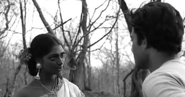 গাছের সামনে অসীম ও অপর্ণা। (আমাদের মনে পড়বে গাছ সম্পর্কে রবীন্দ্রনাথের এক অবিস্মরণীয় উক্তি: This was the tree which has its inner harmony and inner movement of life in its beauty, its strength, its sublime duty of endurance, its pilgrimage to the unknown through the tiniest gates of reincarnation. The Religion of Man, Rabindranath Tagore) গাছের স্তব্ধ প্রসারিত মূল, অনন্ত শিকড়। যে সংলাপকে মানব-মানবীর গভীরতম সংলাপ বলে মনে করেছেন পলিন কেল।
