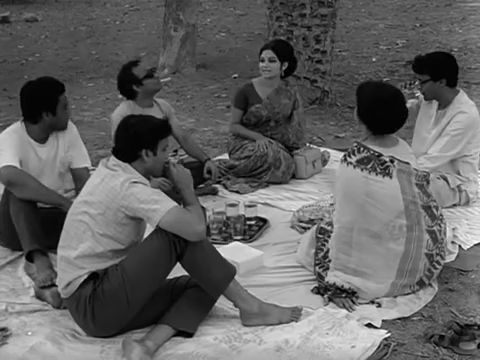 কলকাতা থেকে পালামৌ-তে ছুটি কাটাতে আসা চারজন সমবয়সি ভিন্নধর্মী যুবককে সত্যজিৎ comédie humaine-এর ভঙ্গিতে নির্মোহ ভাবে অণুবীক্ষণ যন্ত্রের নীচে রাখেন, তাঁর ক্লাসিকাল ক্যামেরা-চোখের সামনে তাদের কৃত্রিম মুখোশ নিজেদের অজান্তে আস্তে আস্তে খুলতে শুরু করে, ‘কাঞ্চনজঙ্ঘা’ ছবির মতোই শহর থেকে বাইরে প্রকৃতির পশ্চাদ্পটে টেনে এনে আতসকাচের নীচে রেখে, কিন্তু আরও বেশি চলৎপ্রবাহে, রনোয়ার-এর অন্যতম শ্রেষ্ঠ ছবি ‘রুলস অফ দ্য গেম’-এর মতো। ‘পথের পাঁচালী’ থেকেই মাঝে মাঝে অনেক চরিত্রকে একযোগে মেলে ধরতে চেষ্টা করেছেন তিনি, বিশেষ করে ‘কাঞ্চনজঙ্ঘা’-য়, তাঁর ছবি হয়ে উঠেছে একটি ‘ensemble film’, যেখানে প্রায় সবসময়ই (এবং ভারতীয় ছবিতে হয়তো একমাত্র তাঁর ক্ষেত্রেই) একটি পার্শ্ব-চরিত্রও তুলসী চক্রবর্তী বা পাহাড়ী সান্যালের মতো বহুমাত্রিকতায় এঁকে দিতে পারে জীবনের চিহ্ন আর একটি পূর্ণতার বোধ।