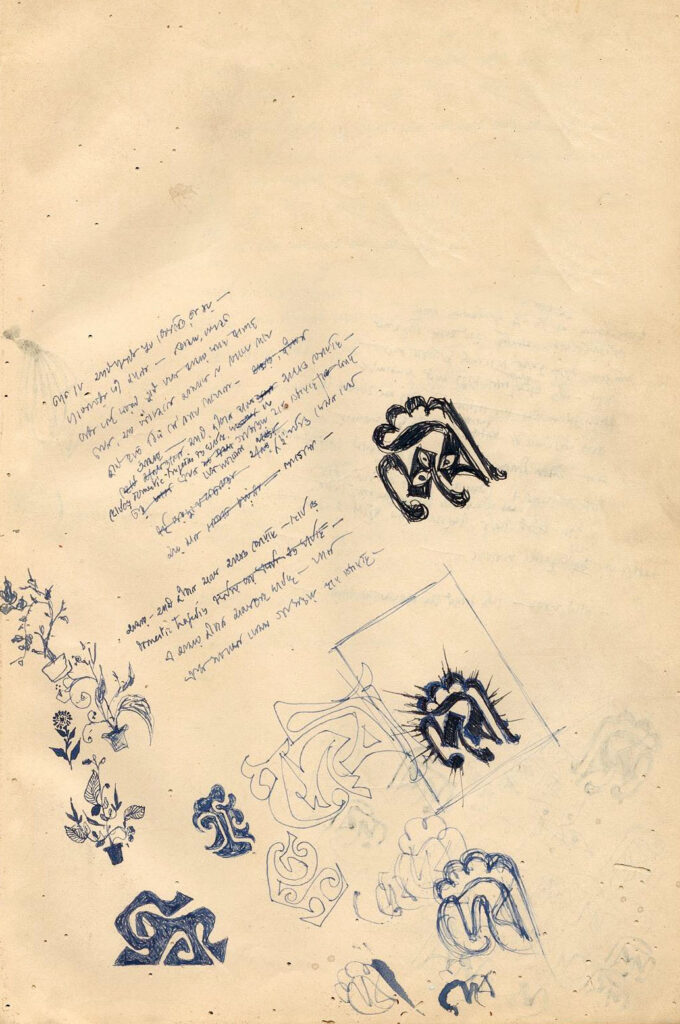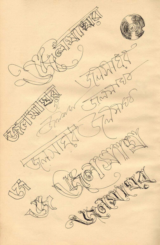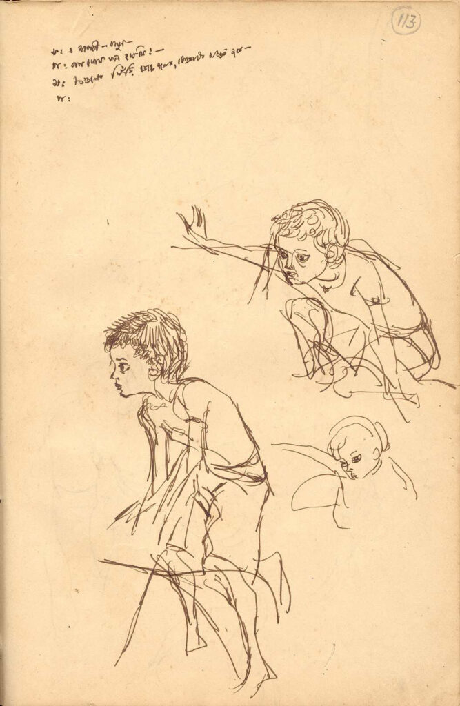 দেবী — এই ছবিতে, একটা জমিদারবাড়ির এক তরুণী বউকে দেবীর অবতার ভেবে পুজো করা শুরু হয়। ছবিটা সেই ধর্মবিষয়ক গোঁড়ামি দেখায়, যা এখনও আমাদের দেশে চলছে। ছবিটার নামটা পোস্টারে বা বিজ্ঞাপনে কীভাবে লেখা হবে, তা নিয়ে সত্যজিৎ অনেক ভেবেছেন, অনেকগুলো নকশা করেছেন। বাংলা অক্ষরগুলোর ছাঁদ দেখে একটা মন্দিরের চুড়োর কথা মনে হয়। দুর্গার ত্রিনেত্রও দেখা যায়। সংলাপের কয়েকটা খসড়া আর কিছু আঁকিবুঁকি পাতাটায় দেখা যাচ্ছে। একটা আঁকিবুঁকিতে ইংরেজি ‘এস’ আর ‘আর’ অক্ষর খেয়াল করা যায়, হয়তো এসআর প্রোডাকশনস-এর লোগো আঁকার কথা ভাবছিলেন।
