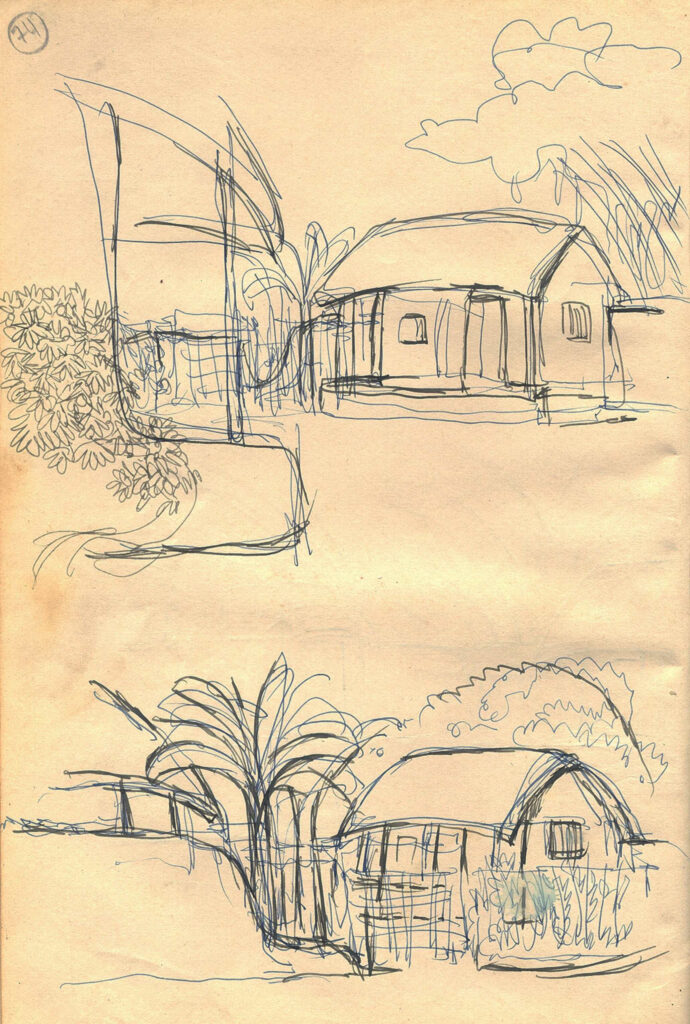 অশনি সংকেত — ১৯৪৩-এ মানুষের তৈরি দুর্ভিক্ষ চলার সময়, গ্রামের পুরোহিত গঙ্গাচরণ এবং তার পরিবারের অবস্থা নিয়ে তৈরি। সত্যজিৎ রায়ের ইউনিট, এই স্কেচটা দেখে বীরভূম জেলার গোয়ালপাড়ায় গঙ্গাচরণের বাড়িটা তৈরি করে।