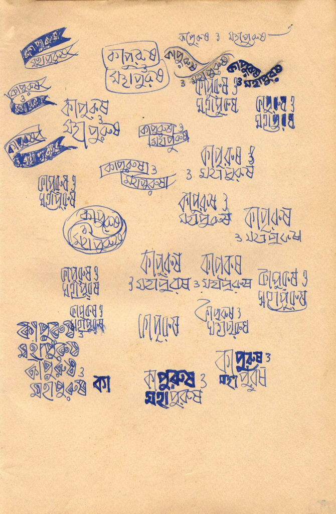 কাপুরুষ ও মহাপুরুষ — দুটো ছোট ছবি, দুটো ছোটগল্প থেকে তৈরি। দুটো শব্দ নিয়ে, অনেক রকমের ক্যালিগ্রাফির চেষ্টা করেছেন সত্যজিৎ। ফাউন্টেন পেনে আঁকা-লেখা এতগুলো অক্ষরছাঁদ তাঁর আশ্চর্য দক্ষতার পরিচয় দেয়।