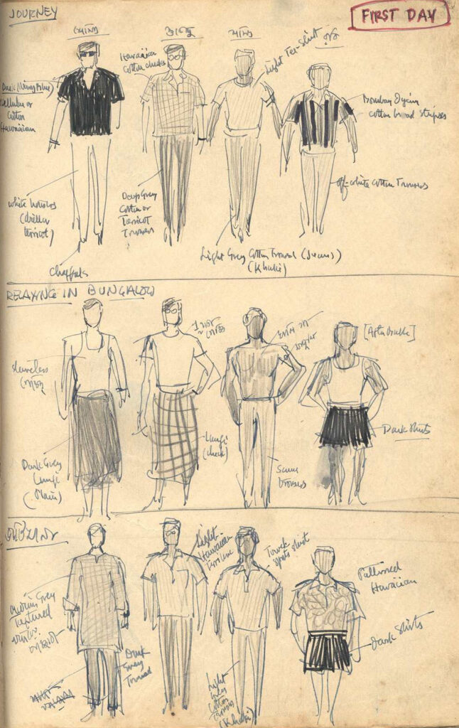 অরণ্যের দিনরাত্রি — চার বন্ধু হঠাৎ পালামৌ-এর জঙ্গলে বেড়াতে চলে যায়, সেখানে তাদের কয়েকদিনের অভিজ্ঞতা নিয়েই ছবি। সত্যজিৎ রায় চার বন্ধুর পোশাক পরিকল্পনা করে, নিখুঁত ছবি এঁকে রেখেছিলেন। কী ধরনের কাপড় ব্যবহৃত হবে পোশাকগুলোয়, তাও ভাবা ছিল। এখানে আমরা দেখতে পাচ্ছি, তারা প্রথমদিন কী পোশাক পরেছিল, গাড়িতে যাওয়ার সময়, রেস্টহাউসে পৌঁছনোর পরে, এবং তারপর একটা দেশি মদের দোকানে যাওয়ার সময়। পোশাকগুলোর মধ্যে দিয়ে, সামাজিক অবস্থান ছাড়াও, প্রতিটি চরিত্রের মানসিকতা ও দৃষ্টিভঙ্গি বোঝা যায়।