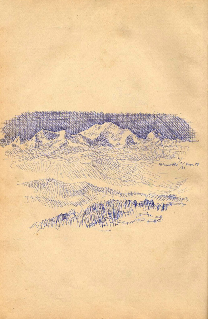 কাঞ্চনজঙ্ঘা — দার্জিলিং বেড়াতে গিয়ে, শহরের বিভিন্ন সামাজিক অবস্থানের কিছু লোকের দেখা হয়। সত্যজিৎ চিত্রনাট্যটা লিখেছিলেন দার্জিলিং-এর মাউন্ট এভারেস্ট হোটেলে, আর অবসর সময়ে ফাউন্টেন পেন দিয়ে কাঞ্চনজঙ্ঘার একটা দারুণ ছবি এঁকেছিলেন। স্কেচটায় তাঁর সই আছে, কোথায় আঁকছেন, কবে আঁকছেন— সবই দেওয়া আছে। মাউন্ট এভারেস্ট হোটেল, রুম নং ৮৮, ২১/ ১০/ ১৯৬১।
