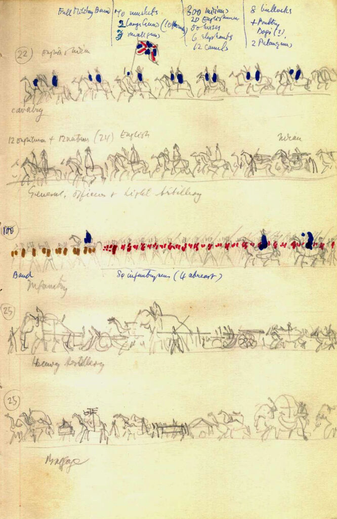 শতরঞ্জ কে খিলাড়ি — মুনশি প্রেমচন্দ-এর একটা ছোটগল্প অবলম্বনে, এই ছবি একদিকে দেখায় ব্রিটিশ রাজত্ব কীভাবে আউধকে গ্রাস করে নিচ্ছে, আর অন্যদিকে দেখায় দাবার নেশায় বুঁদ দুই অভিজাত লোককে। ব্রিটিশ বাহিনী লখনৌয়ে ঢুকছে, এটা দেখানোর জন্য সত্যজিৎ প্রতিটি খুঁটিনাটি সহ সৈন্যদের একটা মিছিল এঁকে রেখেছিলেন, সেনাবাহিনীর ভিন্ন ভিন্ন ডিভিশন বুঝিয়ে। এই ধরনের যে কোনও মিছিলের যতগুলো বৈশিষ্ট্য, সবই ছবিটায় আছে— বাজনদাররা কোথায় থাকবে, তারপর বড় কামান, ছোট বন্দুক, পতাকা, উট, ঘোড়া, হাতি, গরুর গাড়ি, হাঁসমুরগি, কুকুর, পালকি— তালিকা করলে ফুরোবে না। একটা দৃশ্যের পিছনেও কতটা গবেষণা আর ভাবনাচিন্তা ব্যয় করা হয়েছে, ভাবলে অবাক হতে হয়।