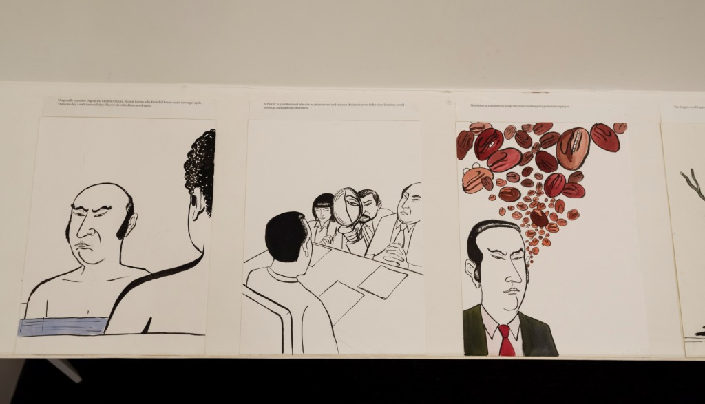 এই পুরুষদের মধ্যে রয়েছেন একজন একদা-খ্যাত কাবুকি অভিনেতা, এক সয় সস কারখানার মালিক, একজন নিঞ্জ-ও-বন (চড়চড়ে আবেগসর্বস্ব জাপানি সিরিয়াল) নির্মাতা, একজন রাঁধুনি, একজন পাঠ্যপুস্তক লেখক, একজন চাকুরে ইত্যাদি আরও কয়েকজন। এদের মধ্যে একজন আছে যে নিজের পেশা জিজ্ঞেস করলে বলে সে একজন ‘প্লেসার’। তার কাজ হচ্ছে চাকরির ইন্টারভিউতে বসে যারা দরখাস্ত করেছে তাদের নিজেদের শ্রেণি, শিক্ষাগত যোগ্যতা, পরিস্থিতি ইত্যাদির নিরিখে ‘প্লেস’ করা এবং তাদের সামাজিক মূল্যায়ন। গল্প এগোনোর সঙ্গে-সঙ্গে এই ব্যক্তির সঙ্গে যারা স্নান করছে, তারা আস্তে-আস্তে টের পায় সে আসলে মানুষ নয়, এক অপদেবতা।